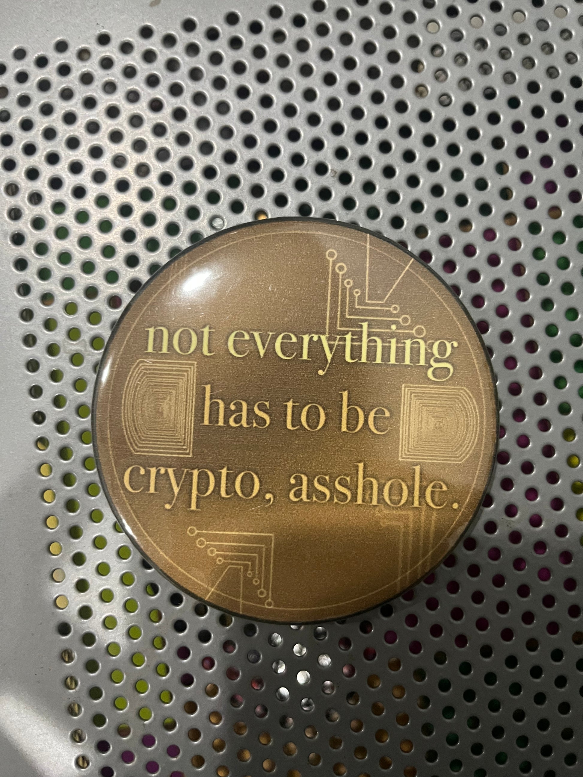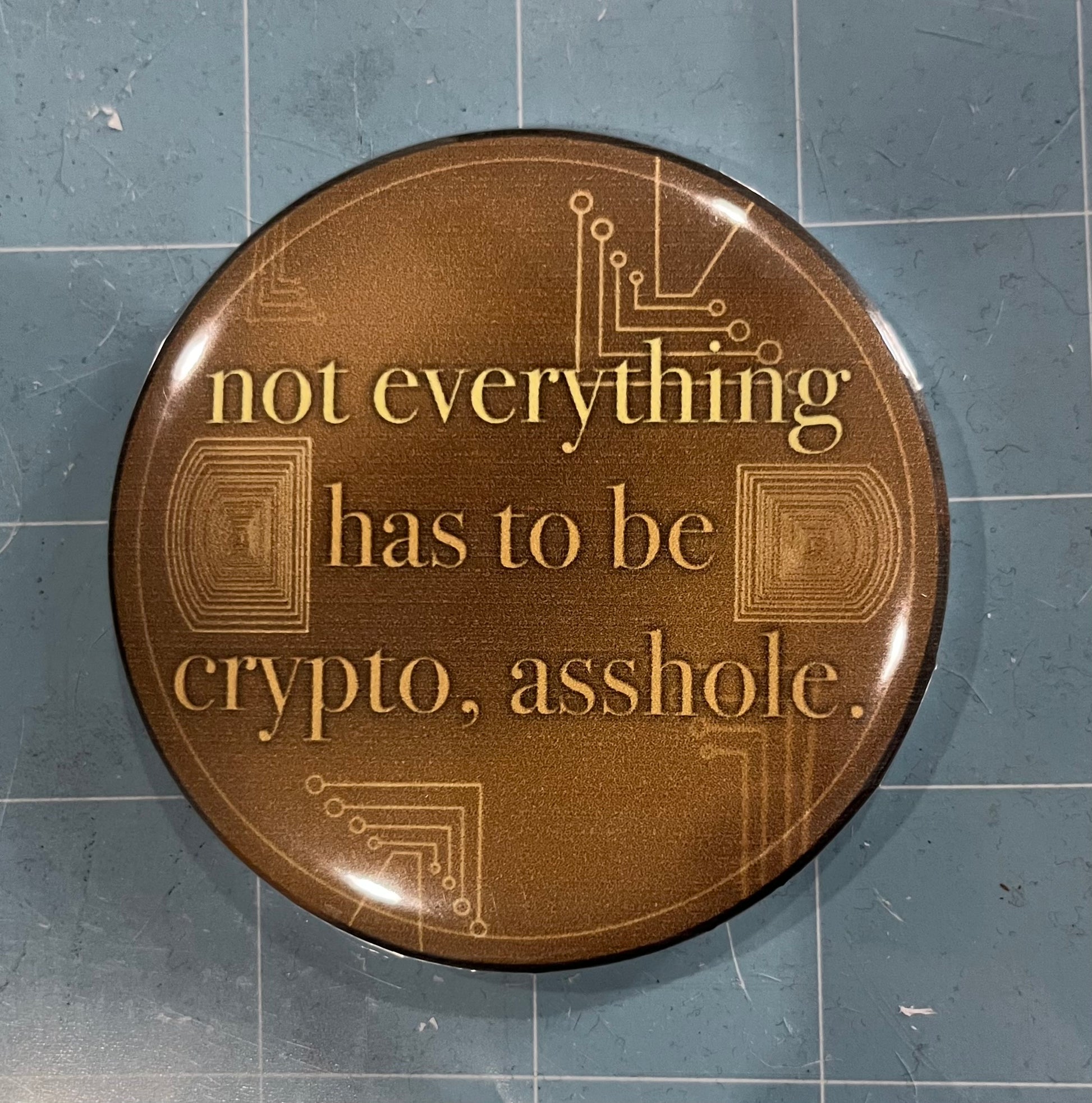 tired of crypto bros ruining your vibe? make a statement with these 3-inch pin back buttons.